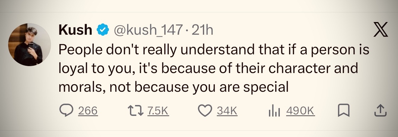 What the X post here is effectively saying is that when others treat you well, this is a reflection of THEIR character, rather than just being something you compelled them to extend to you from sheer greatness or deservedness.